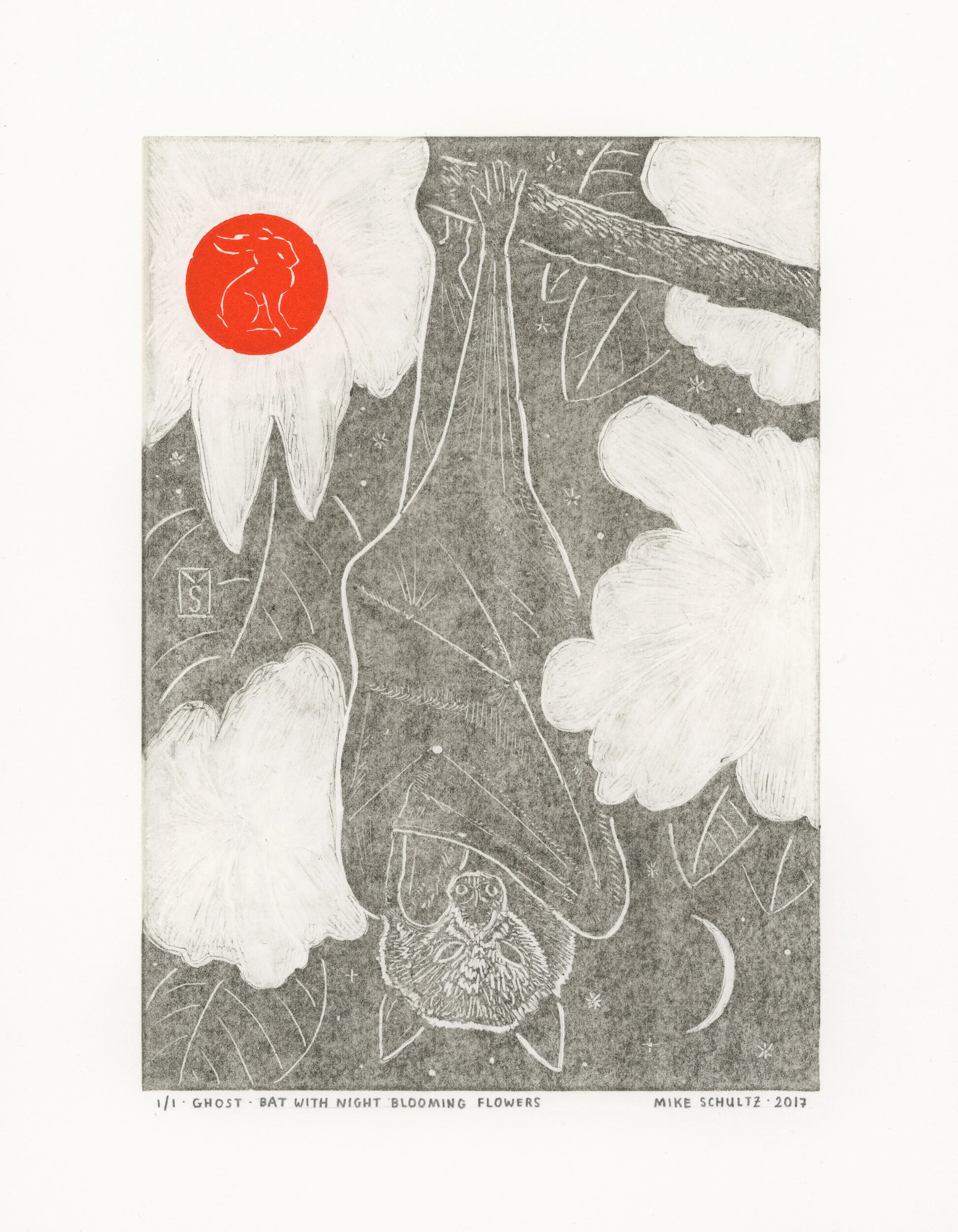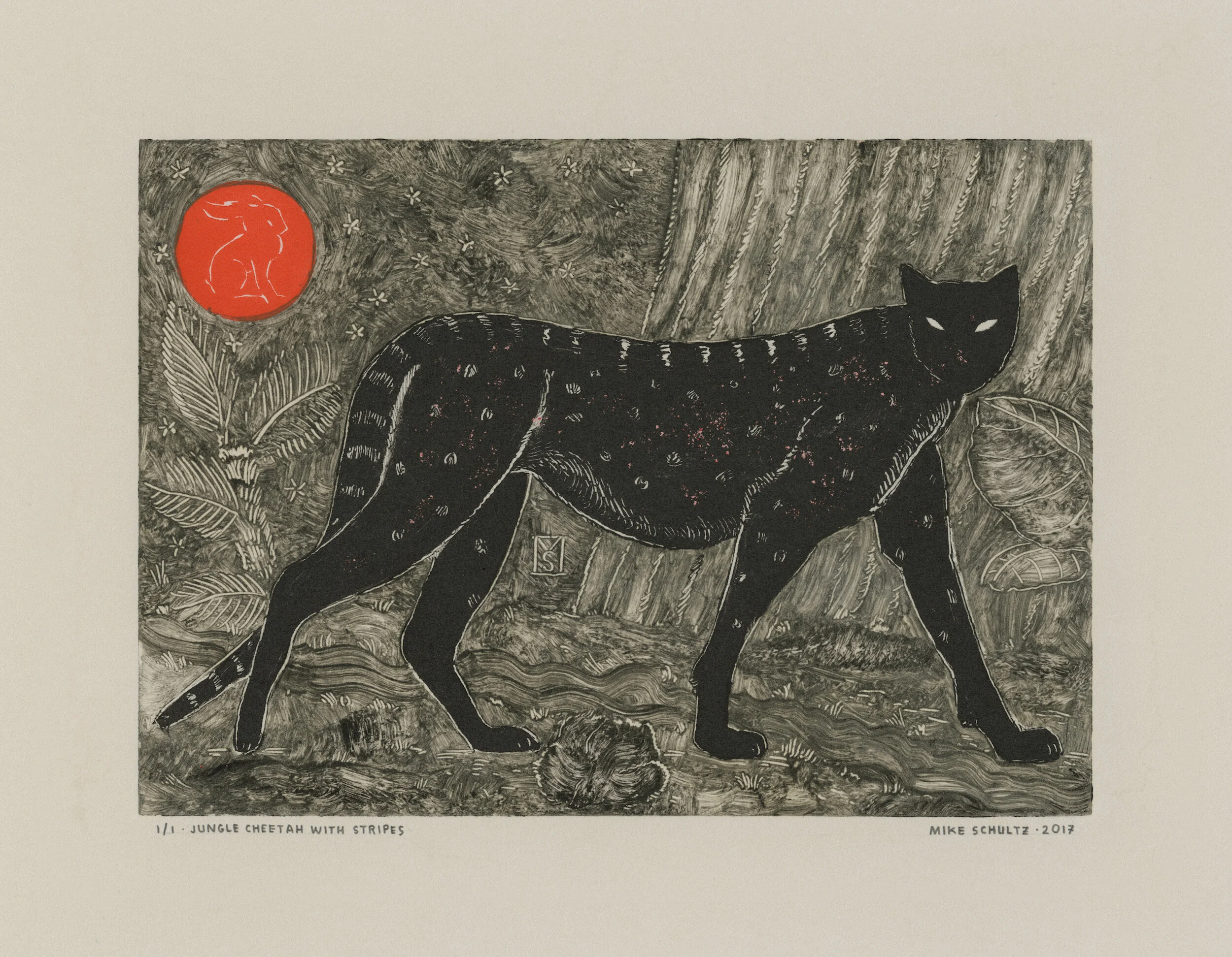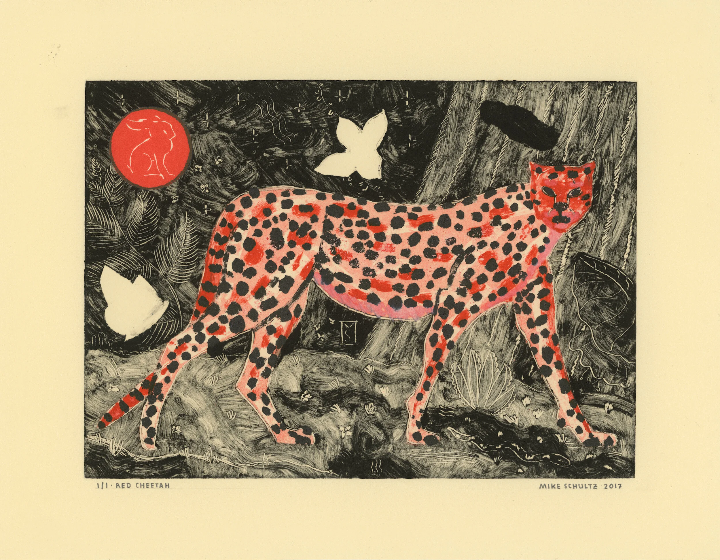 Monotype Process: Monotypes are made with ink on a flat copper plate, and produce only a single print, (and sometimes a second, lighter pull called a “ghost print”— if there is enough ink remaining on the plate after the initial pull). Ghost prints are especially unique, as there is no way to control the variables which determine how they end up printing.