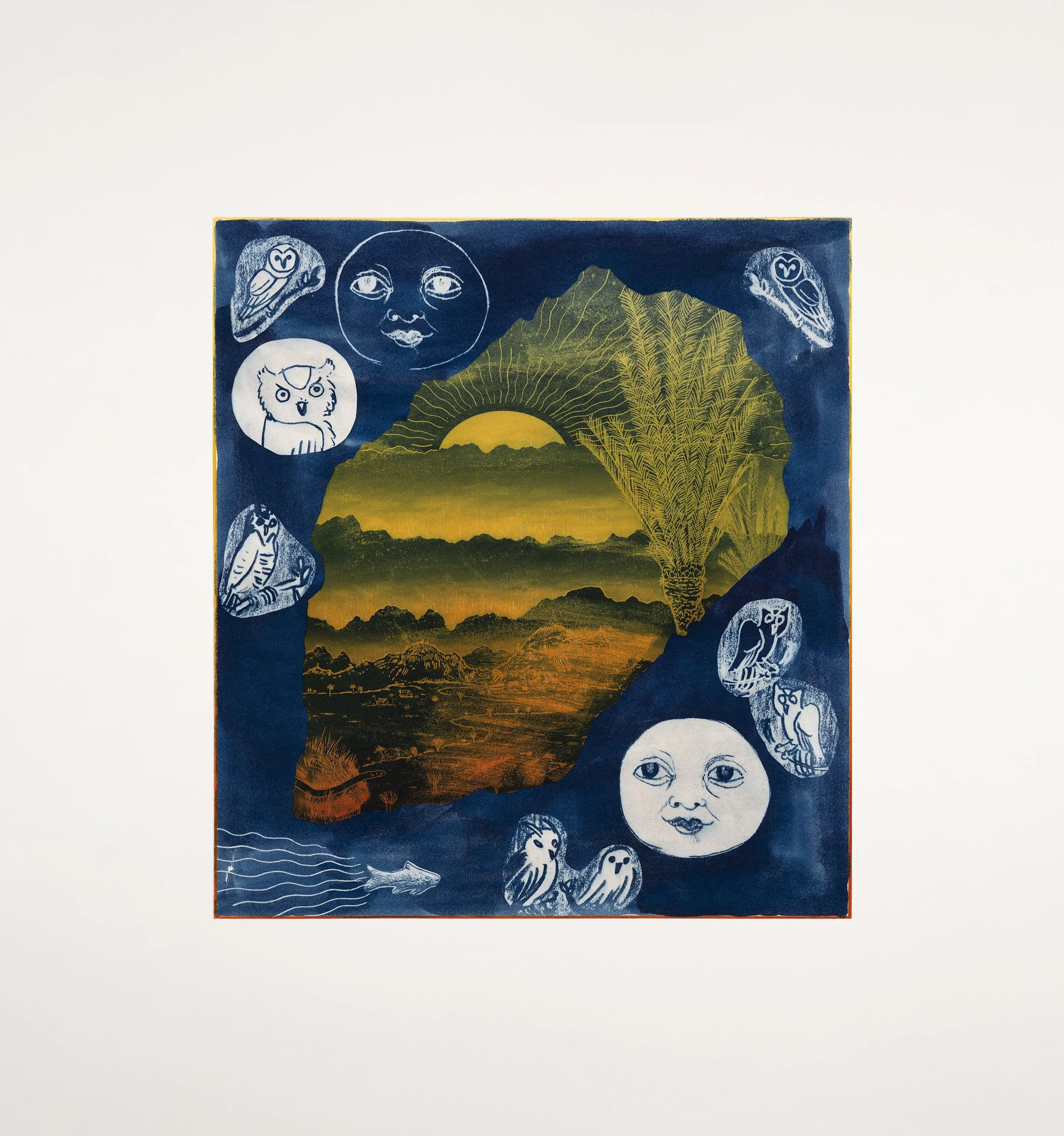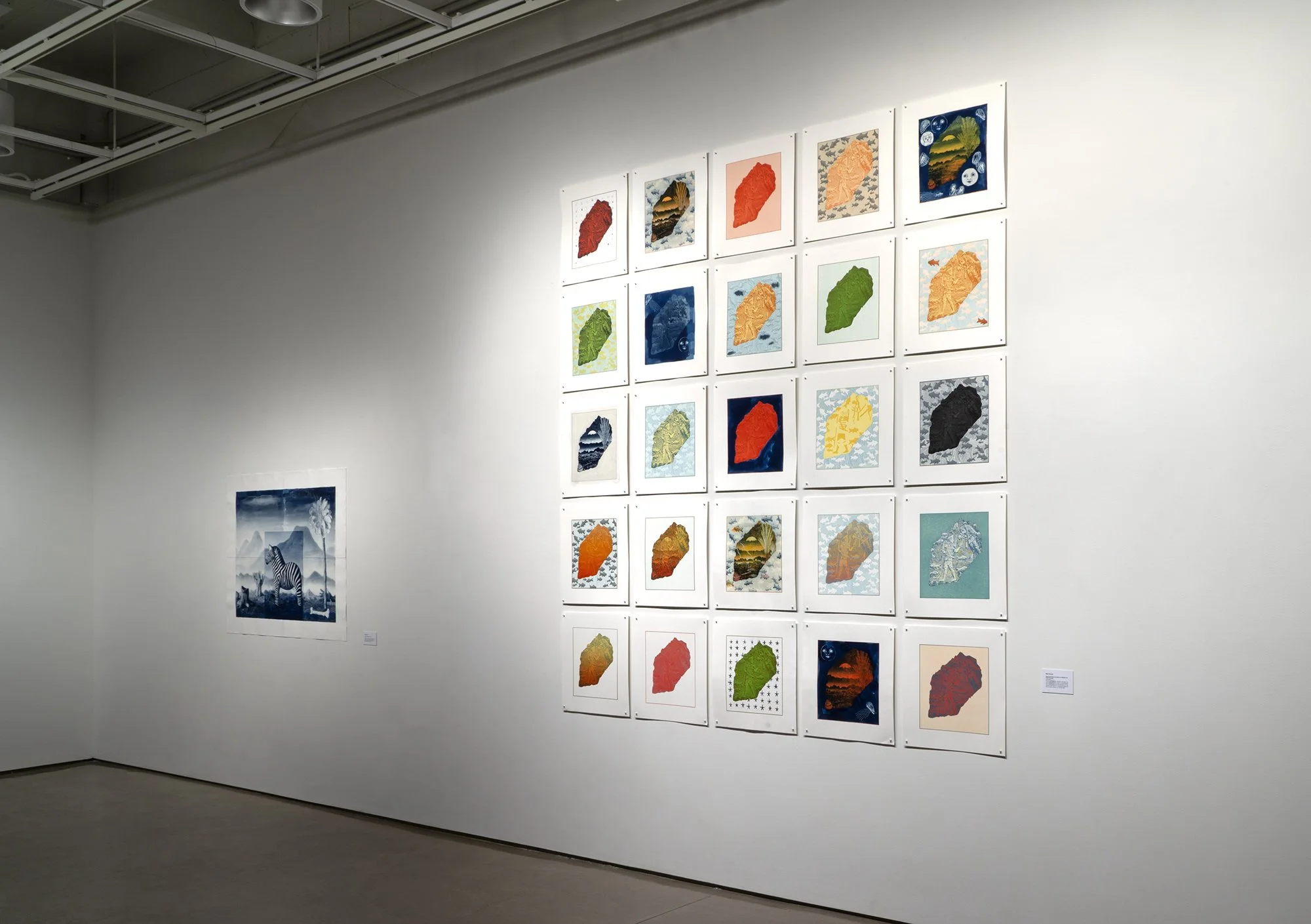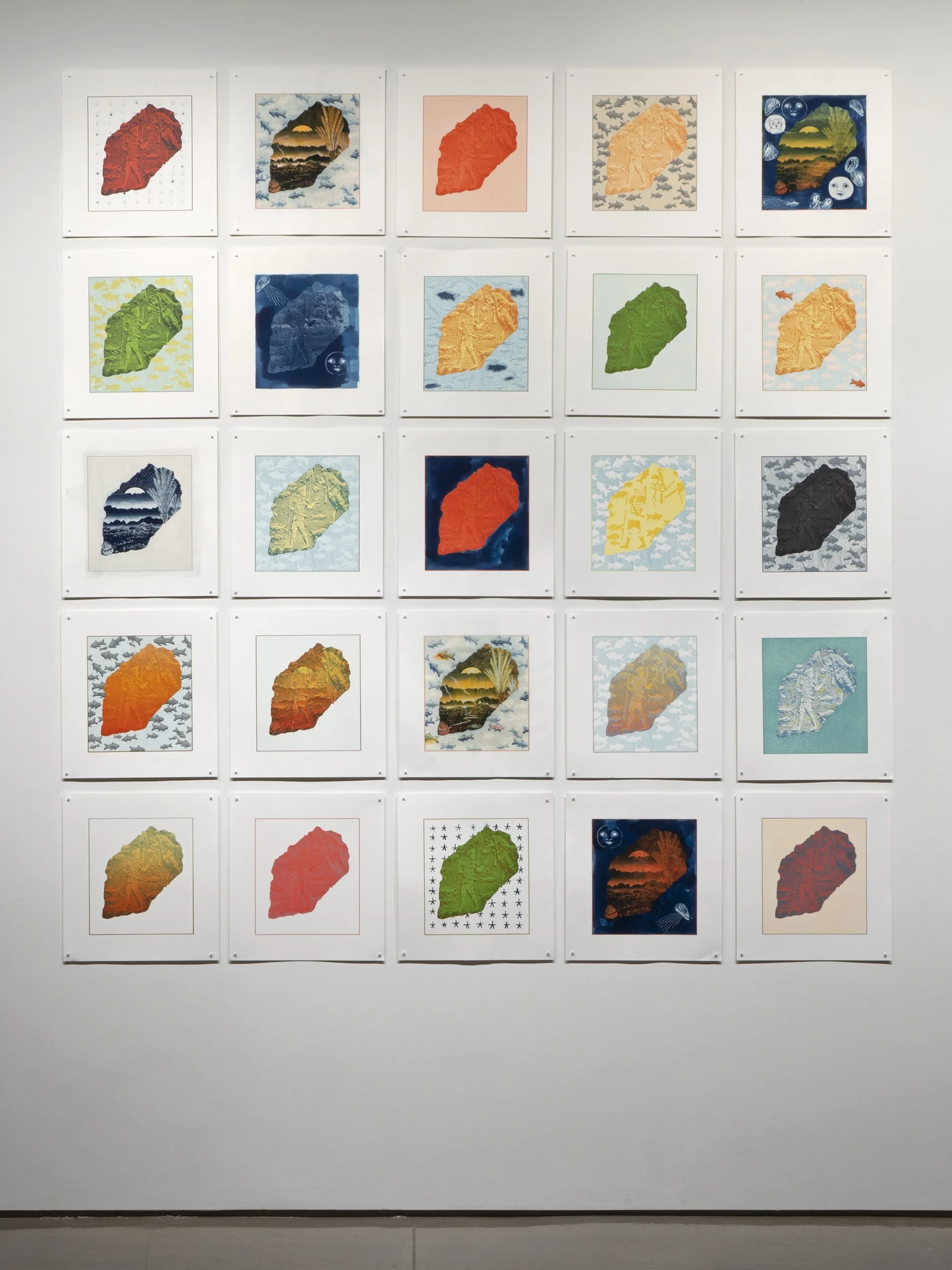 Below is a selection of woodcut and various mixed media prints made at Alfred University in 2023-2024. I made over 100 unique variations of this print using 10 different woodblocks, cyanotype, colored pencil, and china marker. For my MFA Thesis Exhibition I showed a selection of 25 of these prints hung together in a large block on the wall.